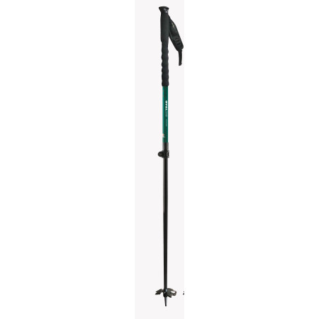 Dwuczęściowe kijki wykonane z ergalu, z przedłużaną rączką i zimowym koszykiem, w kolorze zielonym. Zakres regulacji 105 - 145cm.